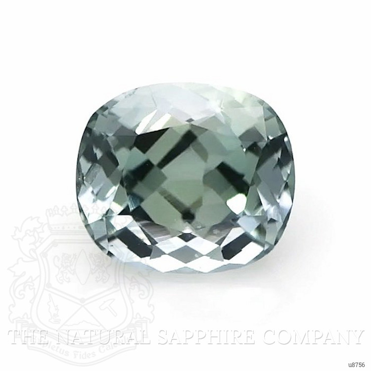 The ring features a beautiful, transparent 0.77 carat cushion shape bluish green sapphire with the dimensions of 5.48 x 4.78 x 3.56 mm and a mixed brilliant cut. It has a clarity grade of very slightly included (evaluated at eye level), medium intense color saturation, and an excellent polish. The origin of this sapphire is Montana.