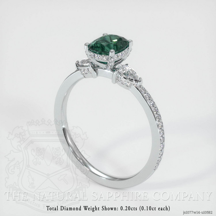 The ring features a beautiful, transparent 0.88 carat cushion shape bluish green sapphire with the dimensions of 6.05 x 5.14 x 3.53 mm and a mixed brilliant cut. It has a clarity grade of very slightly included (evaluated at eye level), intense color saturation, and an excellent polish. The origin of this sapphire is Montana.