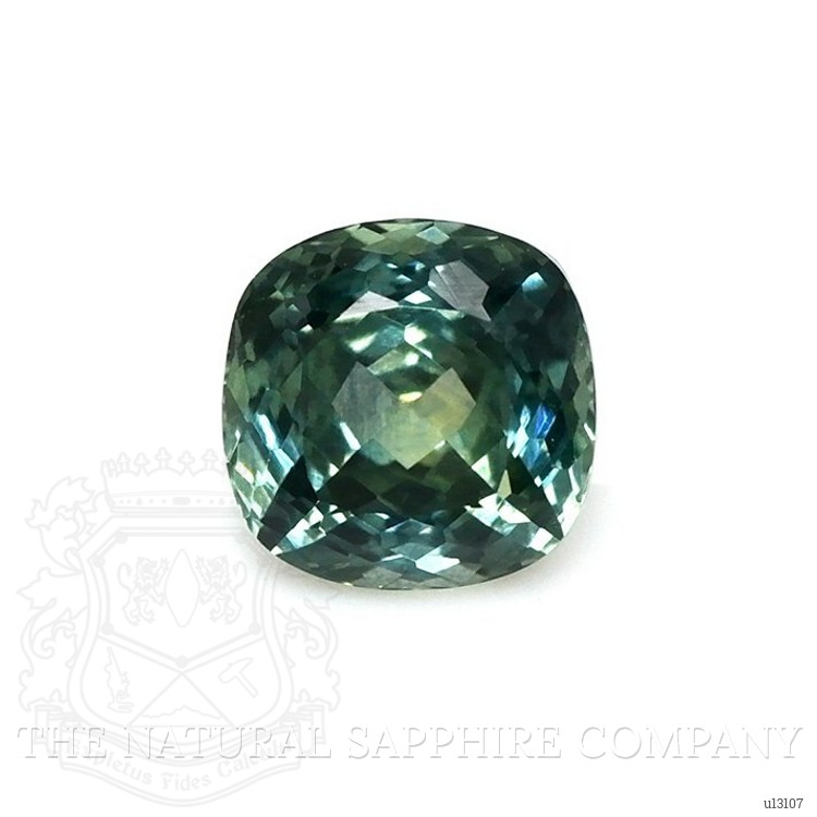 The ring features a beautiful, transparent 1.01 carat cushion shape bluish green sapphire with the dimensions of 5.33 x 5.28 x 3.98 mm and a mixed brilliant cut. It has a clarity grade of eye clean (evaluated at eye level), intense color saturation, and an excellent polish. The origin of this sapphire is Montana.