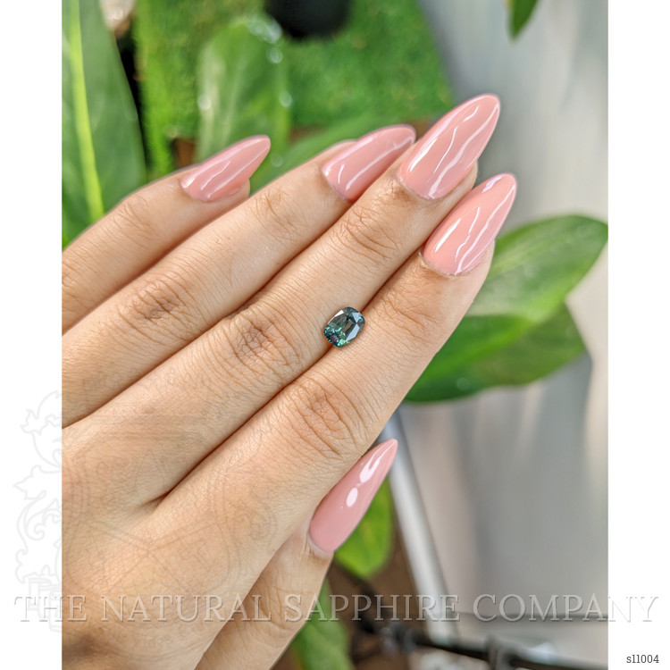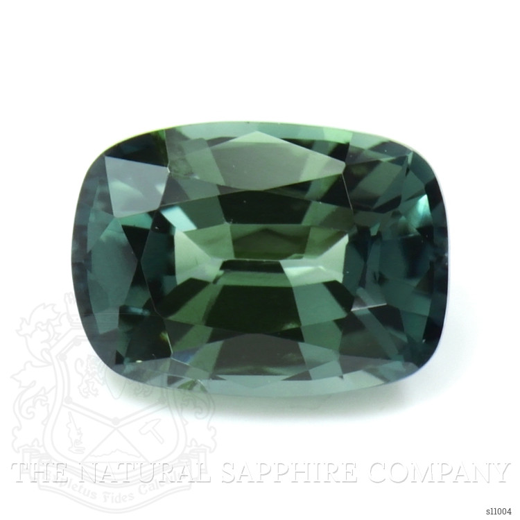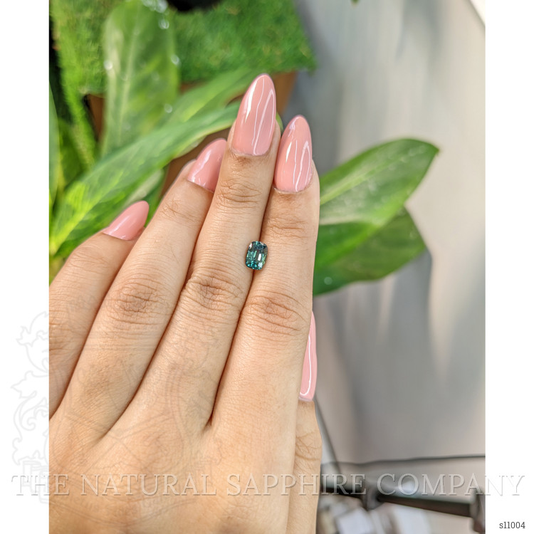The ring features a beautiful, transparent 1.14 carat cushion shape bluish green sapphire with the dimensions of 6.85 x 5.00 x 3.52 mm and a mixed brilliant cut. It has a clarity grade of very slightly included (evaluated at eye level), medium intense color saturation, and an excellent polish. The origin of this sapphire is Madagascar.