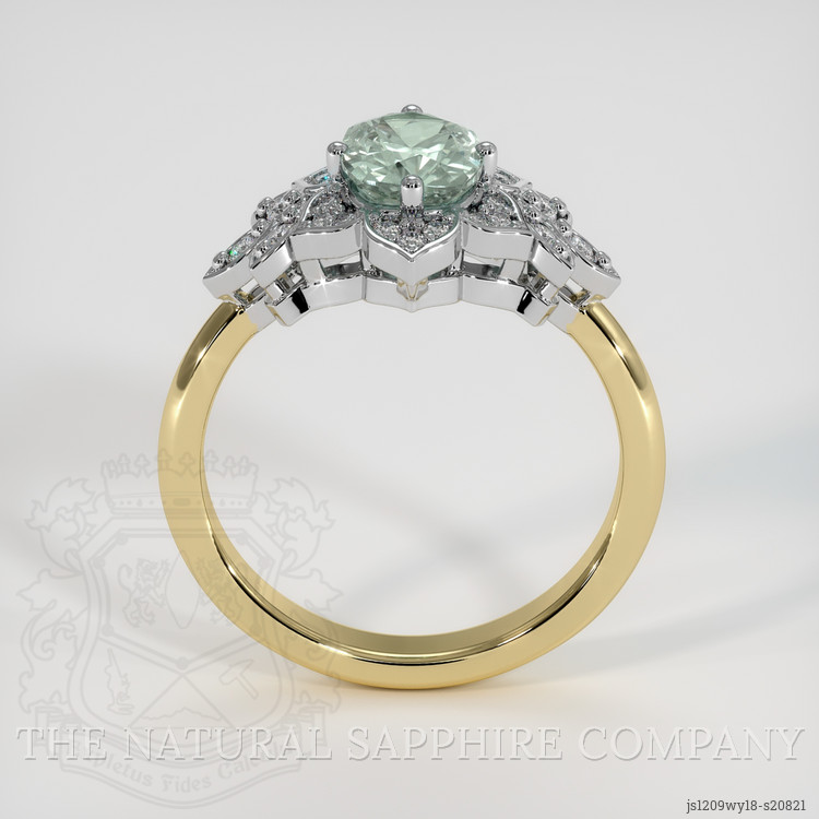 The mounting architecture has been executed to highlight both the sapphire and accompanying white round natural diamonds, which total approximately zero point two six one carats combined, composed of a primary group at approximately zero point one eight carats and secondary accents at approximately zero point zero eight one carats, each graded VS for clarity and F or G for color. The head and halo are executed in eighteen karat white gold to maximize contrast and to enhance the apparent whiteness of the diamond accents, while the shank is rendered in eighteen karat yellow gold to sympathetically warm the bluish green sapphire, creating a balanced color dialogue between center stone and mount. The diamonds are hand set using a combination of secure prong work for larger stones and precise bead or pavé style settings for smaller accents, each seat and bezel milled to close tolerances to ensure tight alignments and minimal gap between stones, a technique that enhances reflected return through the sapphire and reduces light leakage at the crown facets.