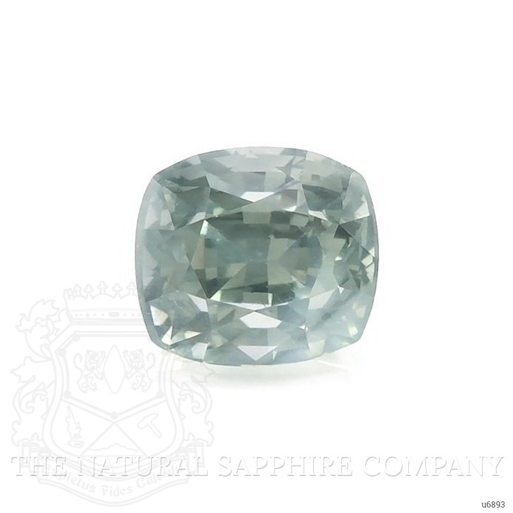 The ring features a beautiful, transparent 1.93 carat cushion shape bluish green sapphire with the dimensions of 6.49 x 5.84 x 5.66 mm and a mixed brilliant cut. It has a clarity grade of very slightly included (evaluated at eye level), medium light color saturation, and an excellent polish. The origin of this sapphire is Montana.