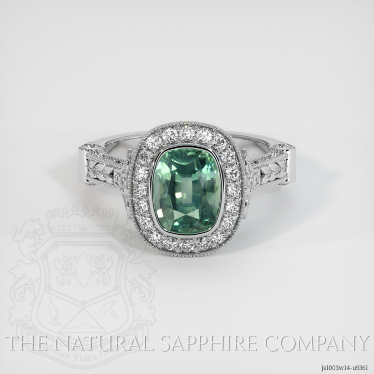 The ring features a beautiful, transparent 2.67 carat cushion shape bluish green sapphire with the dimensions of 8.56 x 6.90 x 4.93 mm and a mixed brilliant cut. It has a clarity grade of very slightly included (evaluated at eye level), medium intense color saturation, and an excellent polish. Enhancement: no enhancement. The origin of this sapphire is Montana.