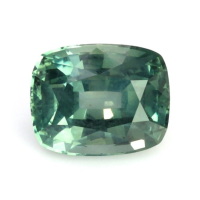 The ring features a beautiful, transparent 2.67 carat cushion shape bluish green sapphire with the dimensions of 8.56 x 6.90 x 4.93 mm and a mixed brilliant cut. It has a clarity grade of very slightly included (evaluated at eye level), intense color saturation, and an excellent polish. The origin of this sapphire is Montana.