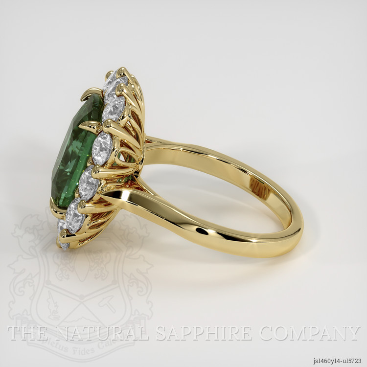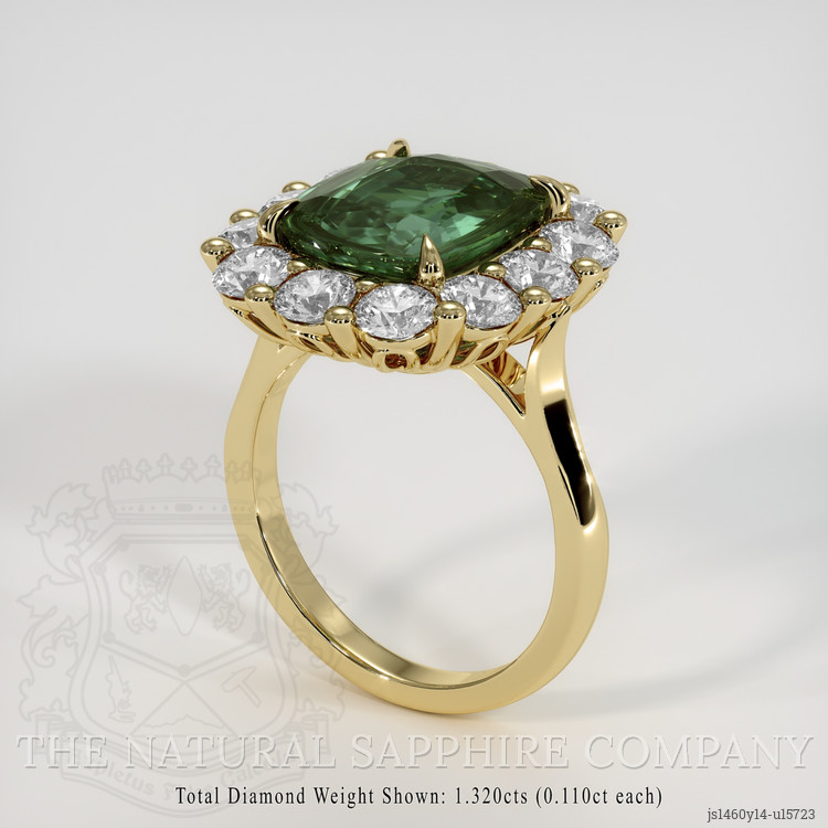 Encircling this sapphire are white diamonds, a constellation of brilliance weighing approximately 1.32 carats. Each gem is carefully selected for its VS1, VS2 clarity and is of a dazzling E color grade. These diamonds are like stars orbiting a striking blue-green planet, enhancing the sapphire's delightful hue with their shimmering beauty. The diamonds, each round in shape, add a sense of timeless elegance, elevating the ring to a piece that resonates not just with opulence, but with a story of love and luxury. Picture the shared joy and eternal memories as you or your loved one admires the sparkle and sophistication contained within each facet.
