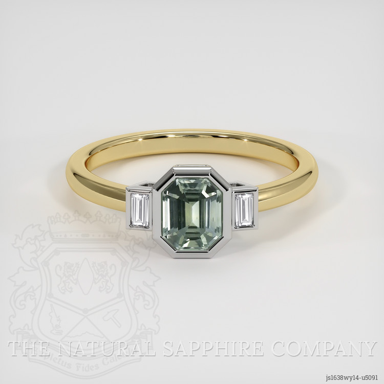 In the realm of timeless elegance and refined taste, this exquisite ring stands as a true object of desire. Crafted for the discerning individual, it represents a sophisticated and luxury-driven style, making ownership a significant achievement and a reflection of one’s impeccable taste and status. The centerpiece of the ring is a breathtaking 0.93 carat emerald-cut bluish green sapphire. This gemstone captivates with its dimensions of 5.96 x 4.80 x 3.66 mm and boasts a clarity grade of very slightly included, perfectly evaluated at eye level. Its medium intense color saturation and excellent polish further enhance its allure. Originating from the renowned lands of Montana, this sapphire carries with it a rich heritage and a story of its own. Adorning each side of this captivating sapphire are white baguette-shaped diamonds weighing approximately 0.12 carats. These diamonds are of Very Slightly Included clarity and possess an E color grade, adding a refined brilliance to the composition. The design is majestically set entirely in a blend of 18K white gold and 18K yellow gold, exuding a sense of grandeur. Beyond its immediate beauty, this ring is more than an accessory; it is a future heirloom. Its timeless elegance ensures that it will be cherished and admired as it is passed down through generations. The ring becomes a symbol of continuity, family legacy, and shared memories, a treasure that binds loved ones through time.