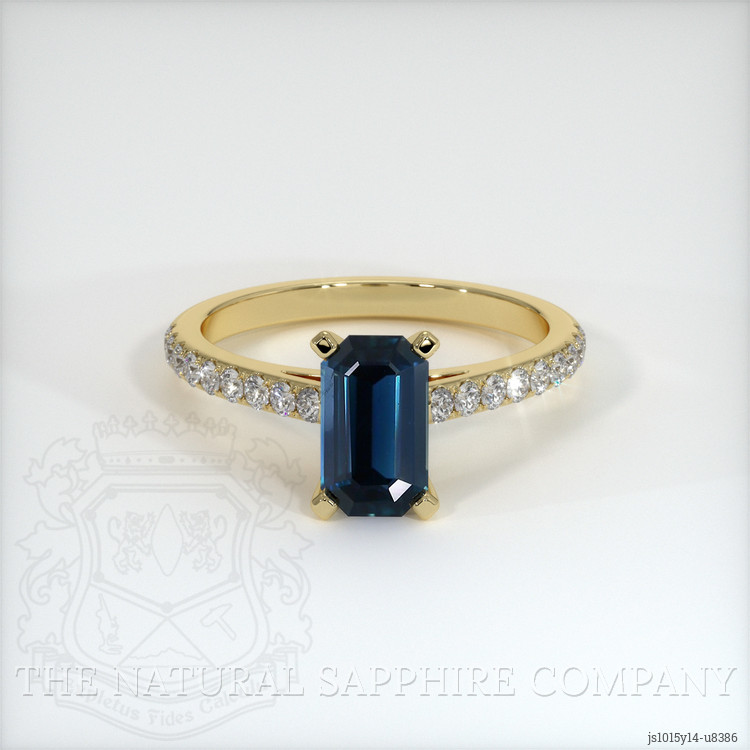 The ring features a beautiful, transparent 1.36 carat emerald cut shape bluish green sapphire with the dimensions of 7.91 x 4.71 x 3.38 mm and a emerald cut. It has a clarity grade of very slightly included (evaluated at eye level), dark color saturation, and an excellent polish. The origin of this sapphire is Nigeria.