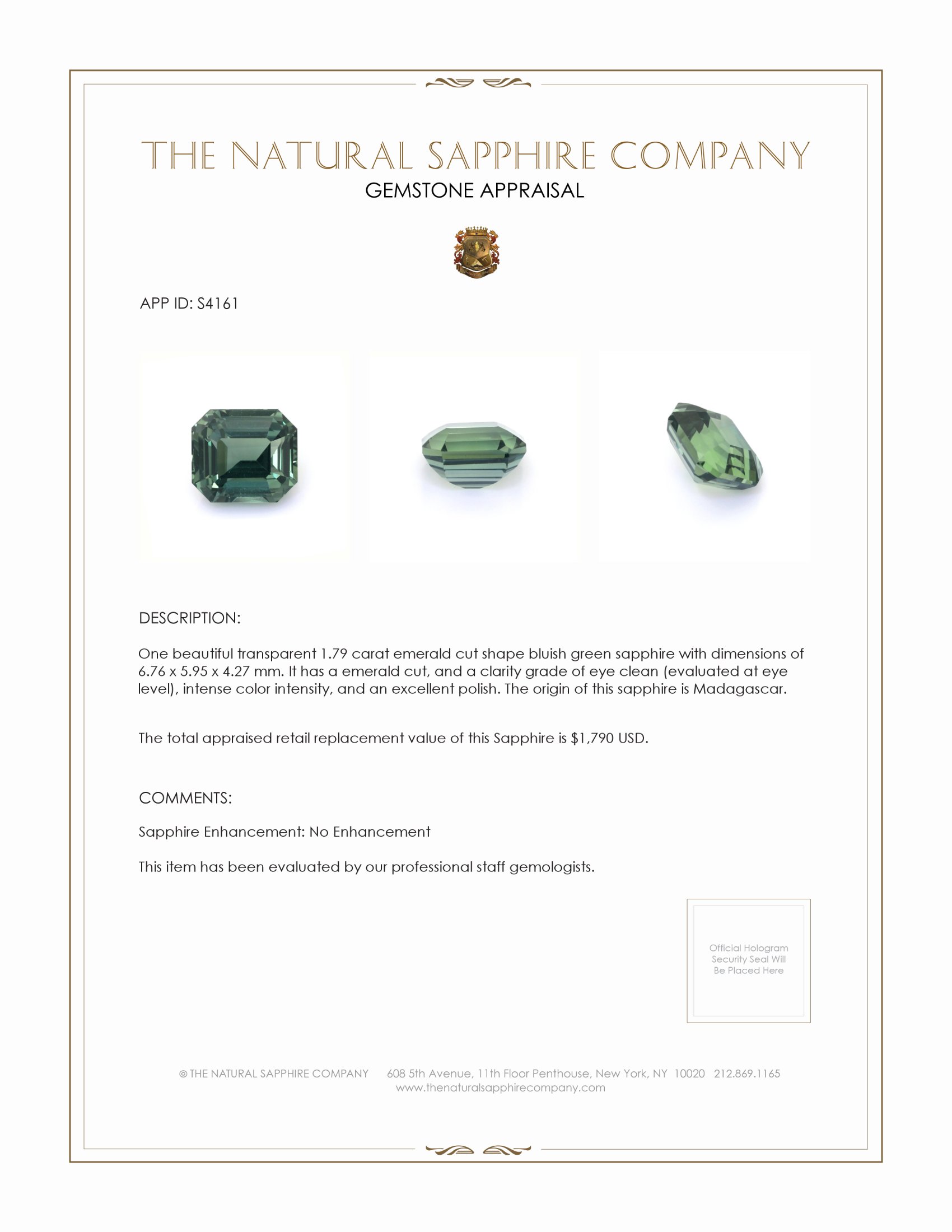 From the rich soils of Madagascar, a hidden treasure begins its journey. This 1.79 carat bluish-green sapphire, with its immaculate emerald cut, emerges after centuries of natural formation. Expert miners carefully uncover the gem, appreciating its intense color saturation and exceptional clarity. This stone, evaluated as eye clean at eye level, symbolizes purity and depth wrought by time.