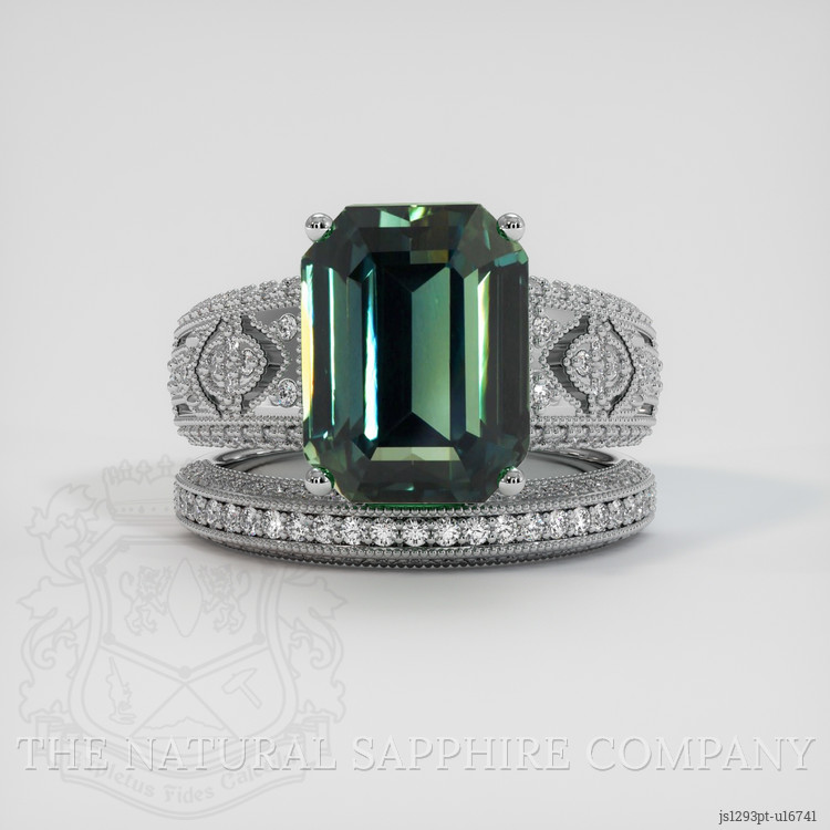 This is a rare and unforgettable engagement ring that speaks to a lifetime of devotion and refined taste, created by The Natural Sapphire Company with exceptional attention to gemological integrity and artisanal finish. At its heart sits a C.Dunaigre certified Intense Green 13.00 carat emerald cut shape greenish blue sapphire from Ceylon Sri Lanka, presented with dimensions 13.56, 10.21, 8.60 mm and a classic step cut that accentuates its architectural beauty. The sapphire is heat treated to reveal a vivid color saturation, it is eye clean when evaluated at eye level, and it displays an excellent polish that allows light to travel through every facet with serene depth. Surrounding this sovereign center gemstone are natural white round diamonds in carefully selected sizes and qualities, approximately 0.108 carats clarity VS color F G, approximately 0.52 carats clarity VS color F G, approximately 0.04 carats clarity VS color F G, and approximately 0.14 carats clarity VS color F G, each set to enhance brilliance without overshadowing the central emerald cut sapphire. The entire setting is crafted in platinum 950 to ensure enduring strength and a luminous cool tone that complements the greenish blue heartstone.