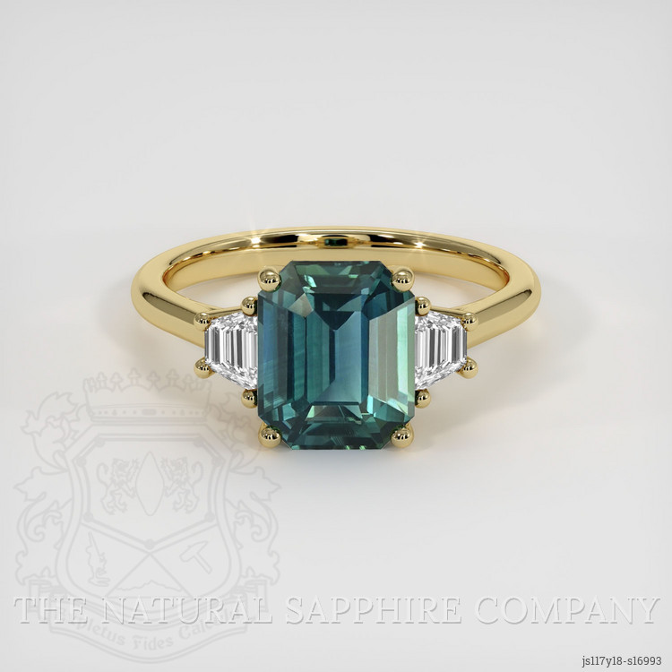 Flanking this central treasure are white trapezoid shaped natural diamonds, weighing approximately 0.30 carats in total, with clarity gradings of Very Slightly Included VS1 and VS2, and a color grade of E. These side stones are chosen and matched to complement the sapphire, providing a crisp, luminous contrast that enhances the bluish green tones without overwhelming them. The entire composition is set in warm 18K yellow gold, a metal that has been associated with permanence and prestige since antiquity. The mounting is crafted with attention to proportion and balance, so that the sapphire sits confidently in the setting, while the trapezoid diamonds add architectural detail and refined sparkle. The Natural Sapphire Company brings decades of gemological expertise to this piece, ensuring that each component is selected for harmony, durability, and long term beauty.