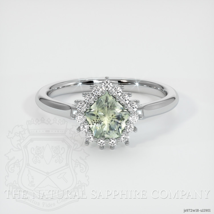 The ring features a beautiful, transparent 0.81 carat fancy shape bluish green sapphire with the dimensions of 6.38 x 6.11 x 3.64 mm and a fancy brilliant cut. It has a clarity grade of very slightly included (evaluated at eye level), medium color saturation, and an excellent polish. The origin of this sapphire is Montana.