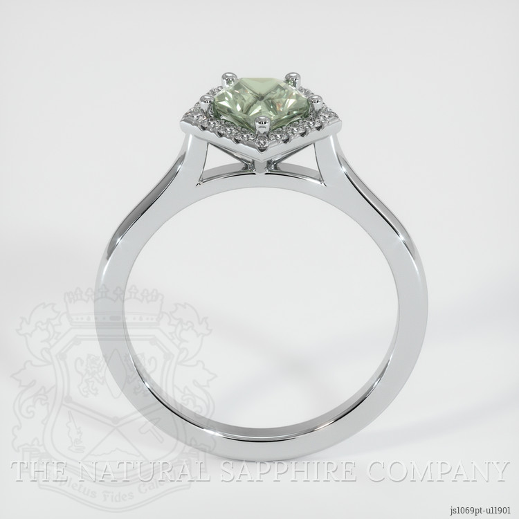 The ring features a beautiful, transparent 0.81 carat fancy shape bluish green sapphire with the dimensions of 6.38 x 6.11 x 3.64 mm and a fancy brilliant cut. It has a clarity grade of very slightly included (evaluated at eye level), medium color saturation, and an excellent polish. The origin of this sapphire is Montana.