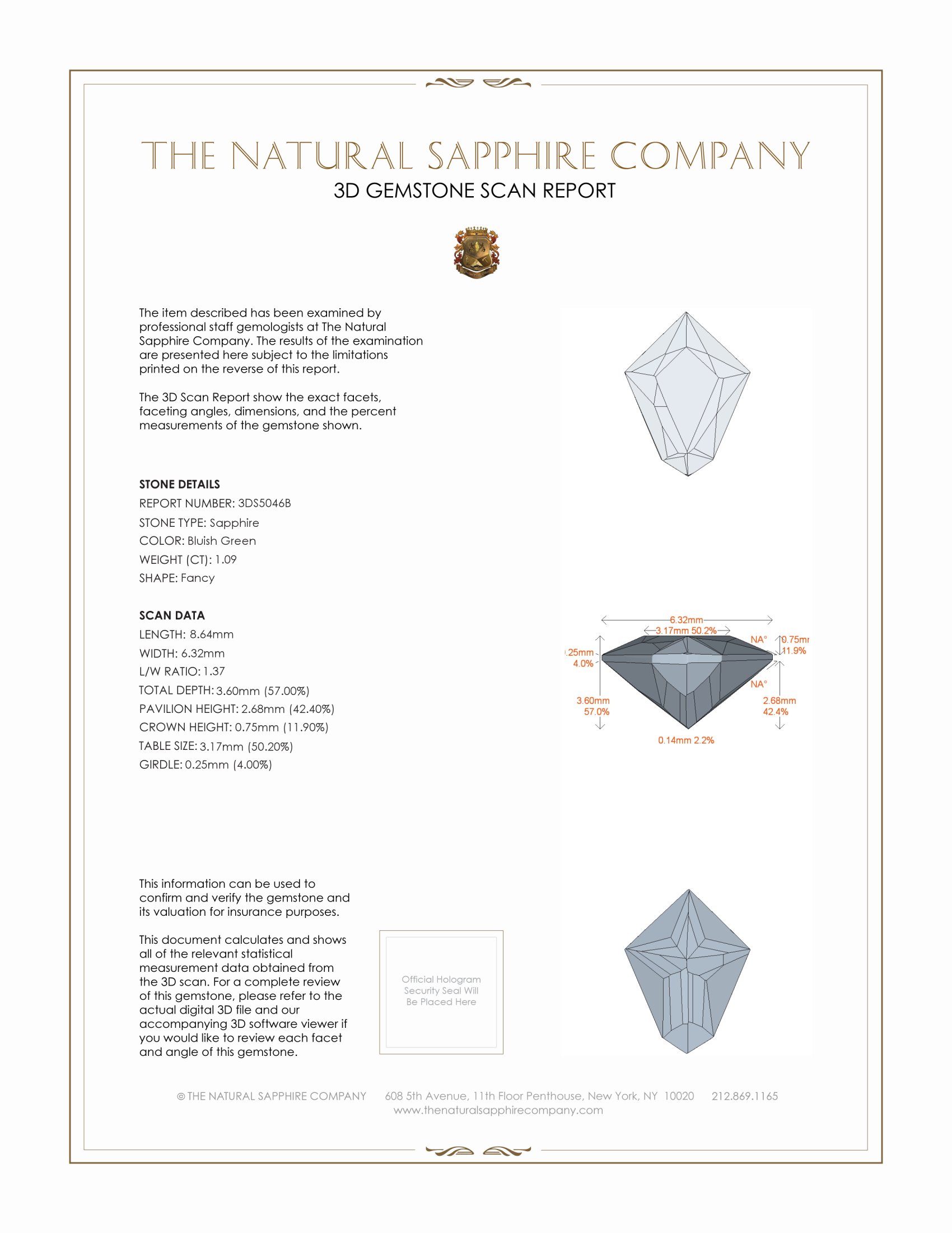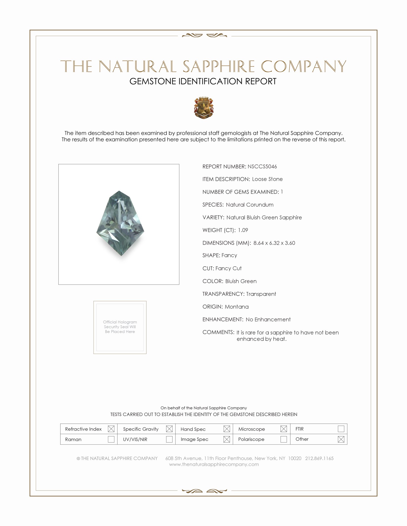 The ring features a beautiful, transparent 1.09 carat fancy shape bluish green sapphire with the dimensions of 8.64 x 6.32 x 3.60 mm and a fancy cut. It has a clarity grade of very slightly included (evaluated at eye level), intense color saturation, and an excellent polish. The origin of this sapphire is Montana.