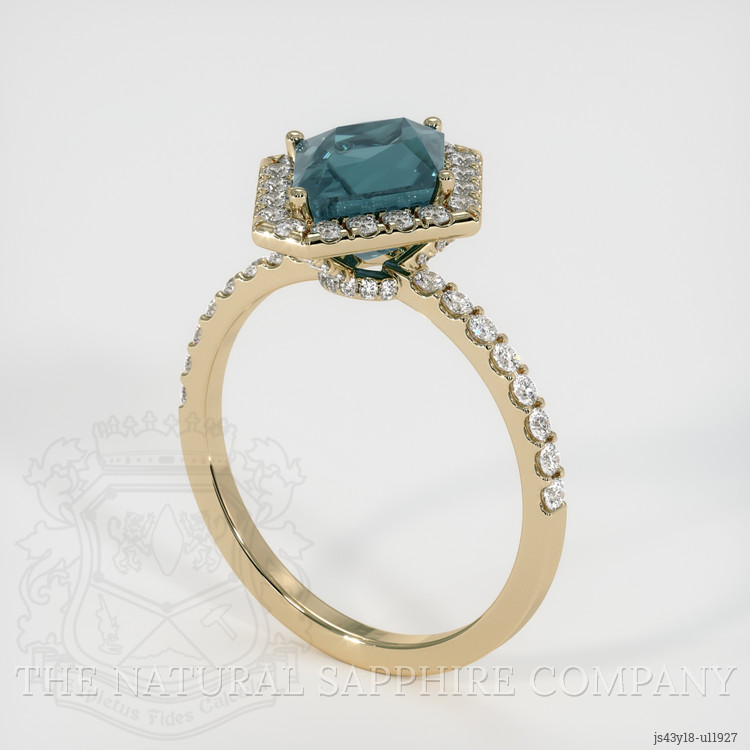 The ring features a beautiful, transparent 2.40 carat fancy shape bluish green sapphire with the dimensions of 9.14 x 7.42 x 5.74 mm and a fancy brilliant cut. It has a clarity grade of very slightly included (evaluated at eye level), intense color saturation, and an excellent polish. The origin of this sapphire is Montana.