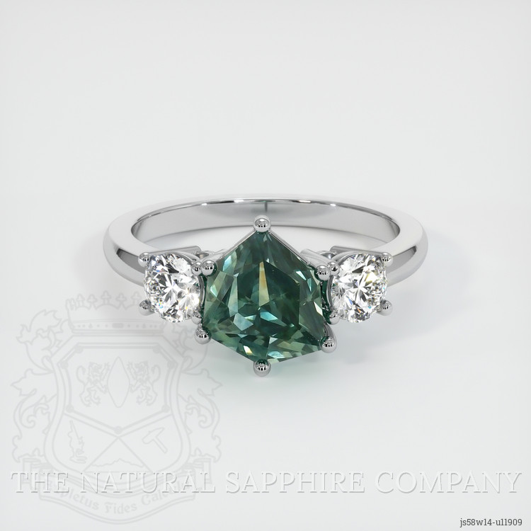 The ring features a beautiful, transparent 2.44 carat fancy shape bluish green sapphire with the dimensions of 7.37 x 7.64 x 5.93 mm and a fancy brilliant cut. It has a clarity grade of eye clean (evaluated at eye level), intense color saturation, and an excellent polish. The origin of this sapphire is Montana.