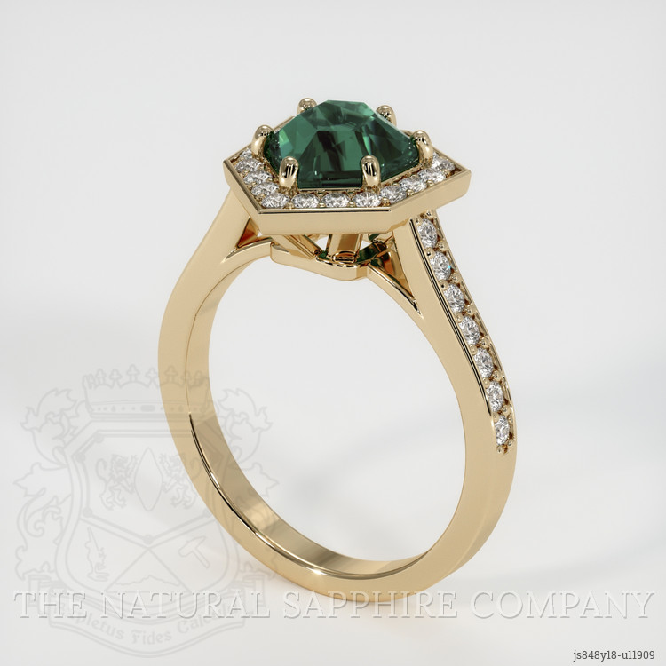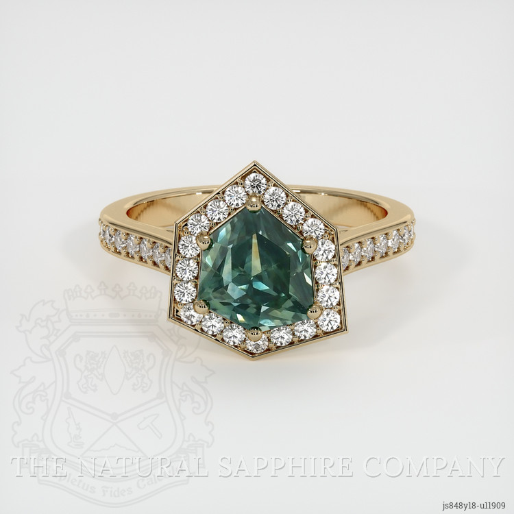 The ring features a beautiful, transparent 2.44 carat fancy shape bluish green sapphire with the dimensions of 7.37 x 7.64 x 5.93 mm and a fancy brilliant cut. It has a clarity grade of eye clean (evaluated at eye level), intense color saturation, and an excellent polish. The origin of this sapphire is Montana.