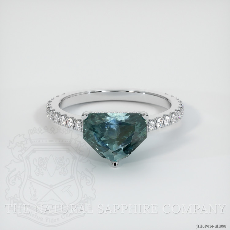The ring features a beautiful, transparent 2.59 carat fancy shape bluish green sapphire with the dimensions of 6.78 x 8.76 x 5.83 mm and a fancy brilliant cut. It has a clarity grade of slightly included (evaluated at eye level), intense color saturation, and an excellent polish. The origin of this sapphire is Montana.