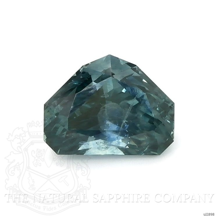 The ring features a beautiful, transparent 2.59 carat fancy shape bluish green sapphire with the dimensions of 6.78 x 8.76 x 5.83 mm and a fancy brilliant cut. It has a clarity grade of slightly included (evaluated at eye level), intense color saturation, and an excellent polish. The origin of this sapphire is Montana.