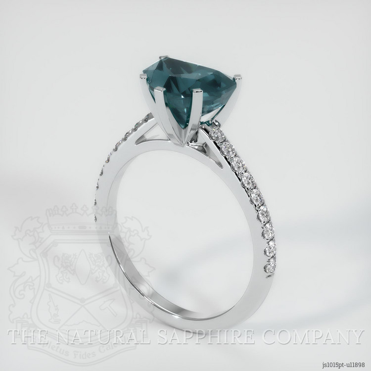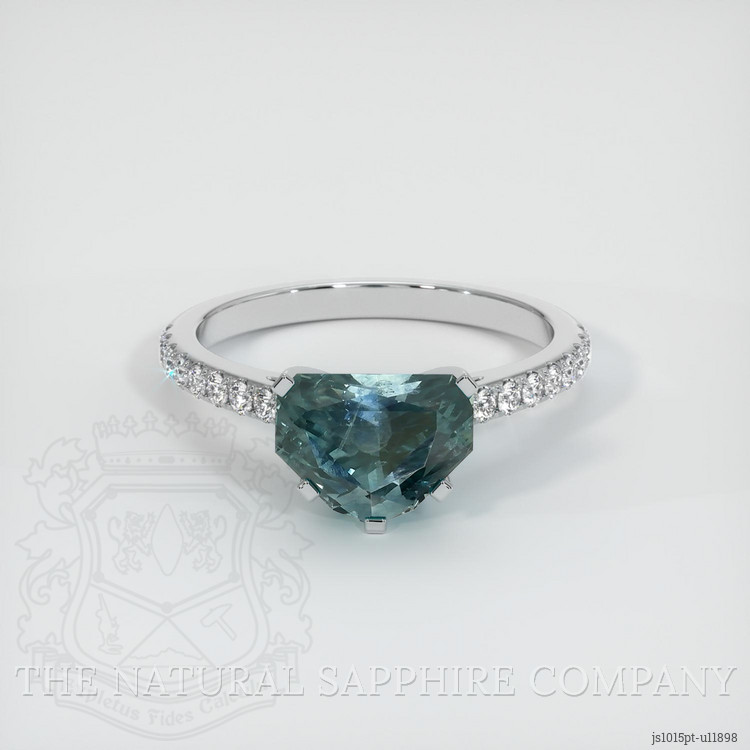 The ring features a beautiful, transparent 2.59 carat fancy shape bluish green sapphire with the dimensions of 6.78 x 8.76 x 5.83 mm and a fancy brilliant cut. It has a clarity grade of slightly included (evaluated at eye level), intense color saturation, and an excellent polish. The origin of this sapphire is Montana.