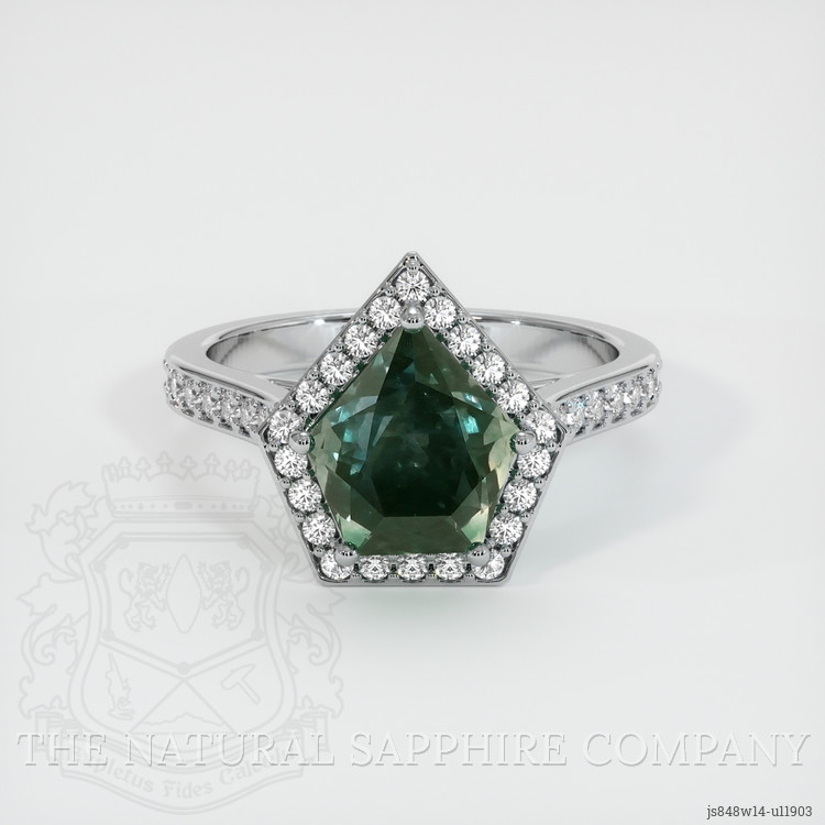The ring features a beautiful, transparent 3.44 carat fancy shape bluish green sapphire with the dimensions of 9.04 x 8.42 x 6.97 mm and a fancy brilliant cut. It has a clarity grade of very slightly included (evaluated at eye level), vivid color saturation, and an excellent polish. The origin of this sapphire is Montana.