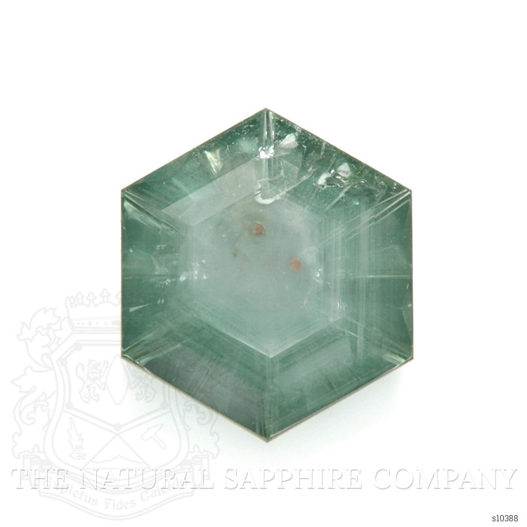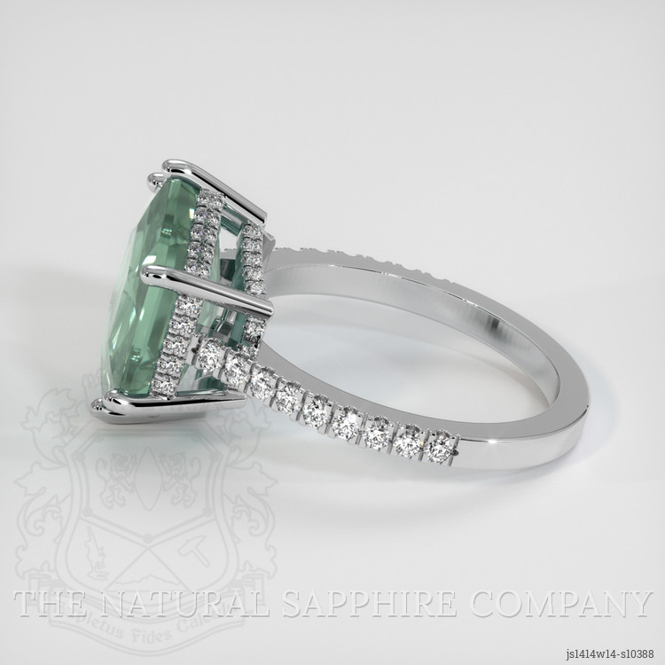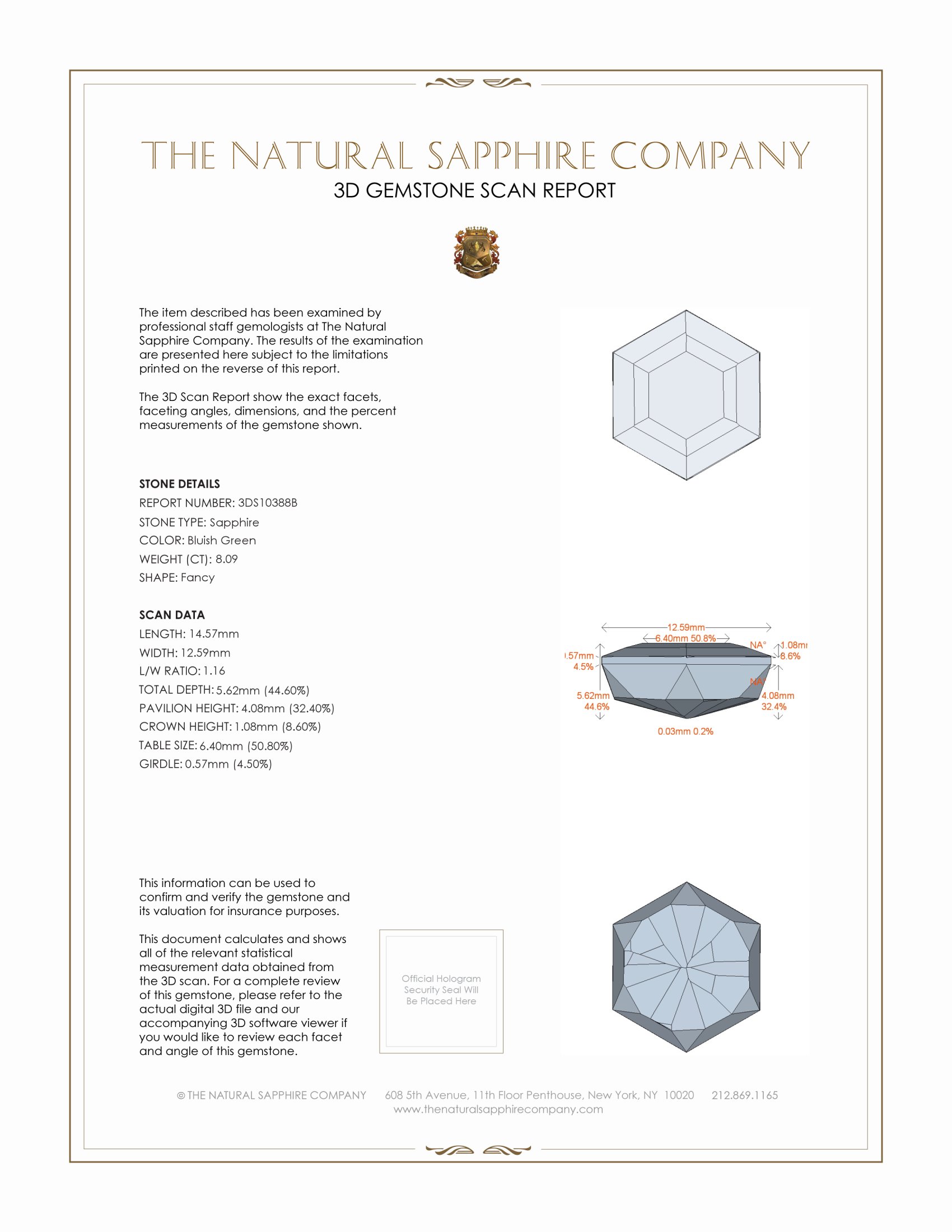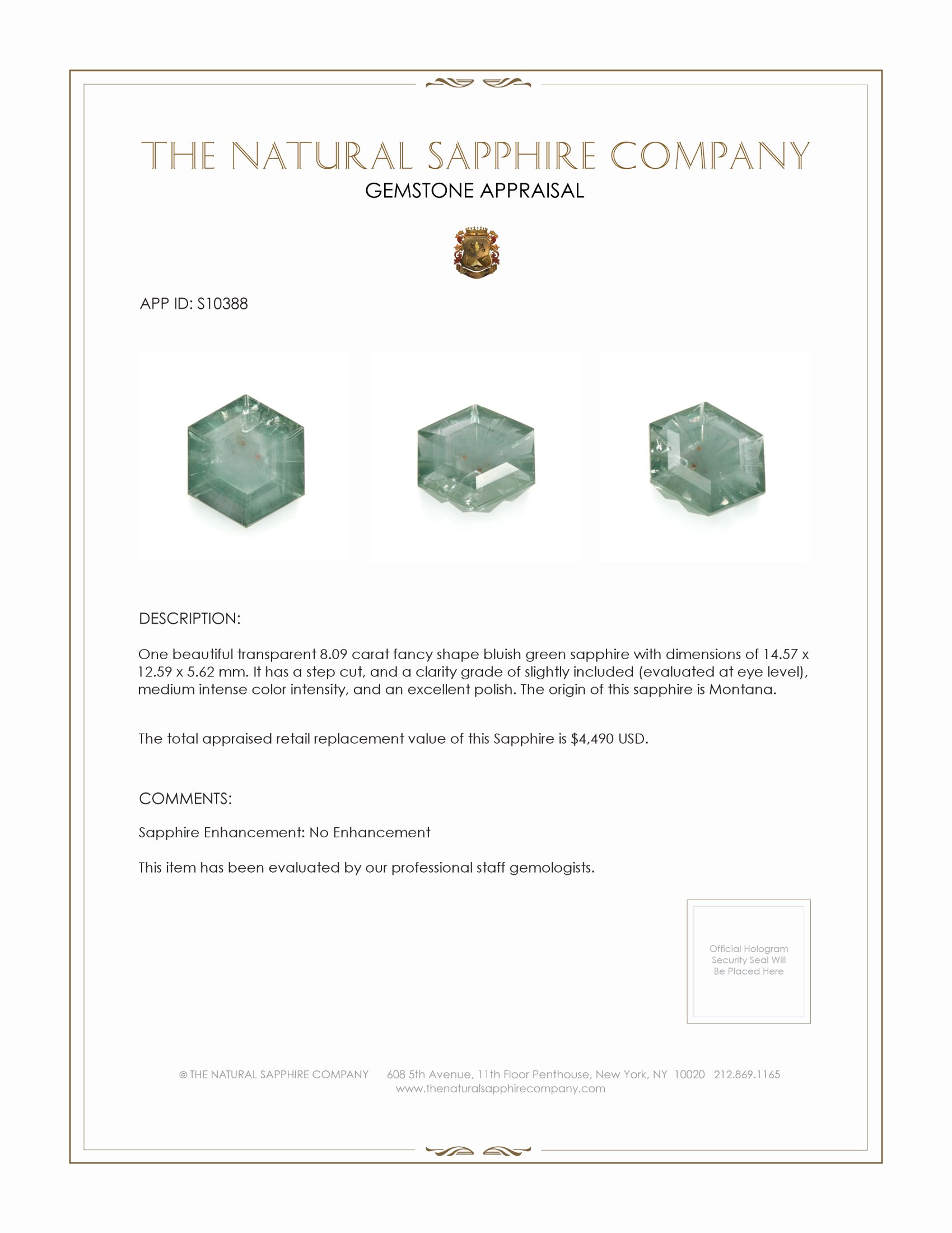 The ring features a beautiful, transparent 8.09 carat fancy shape bluish green sapphire with the dimensions of 14.57 x 12.59 x 5.62 mm and a step cut. It has a clarity grade of slightly included (evaluated at eye level), intense color saturation, and an excellent polish. The origin of this sapphire is Montana.