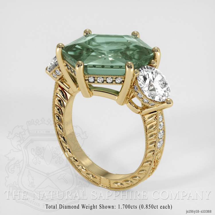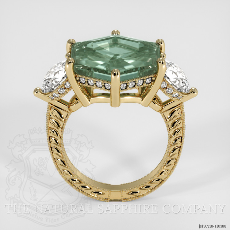 Envision a creation that dances with enchanting elegance. This exquisite ring holds within its embrace a beautiful, transparent 8.09 carat fancy shape bluish green sapphire. With dimensions of 14.57 x 12.59 x 5.62 mm and a mesmerizing step cut, this gemstone radiates a subtle yet captivating allure. Its clarity, graded as slightly included upon close inspection, adds a touch of uniqueness to its character. The sapphire, born of Montana, boasts intense color saturation and an excellent polish, encapsulating a profound sense of timeless beauty.