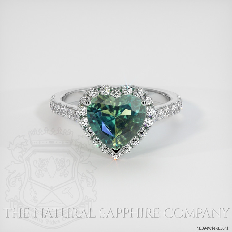 The ring features a beautiful, transparent 2.54 carat heart shape bluish green sapphire with the dimensions of 7.96 x 8.28 x 5.00 mm and a mixed brilliant cut. It has a clarity grade of very slightly included (evaluated at eye level), vivid color saturation, and an excellent polish. The origin of this sapphire is Ceylon (Sri Lanka).