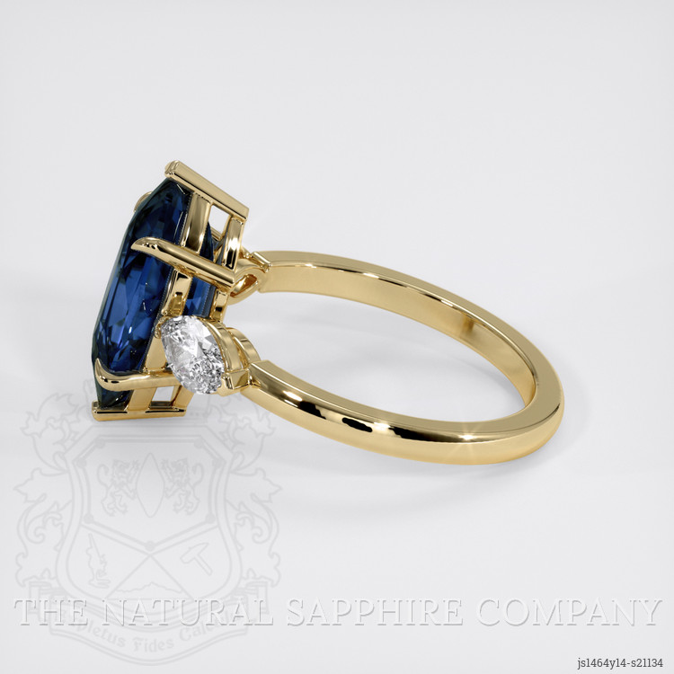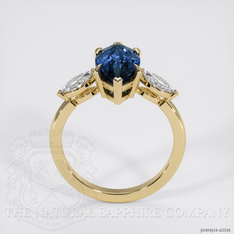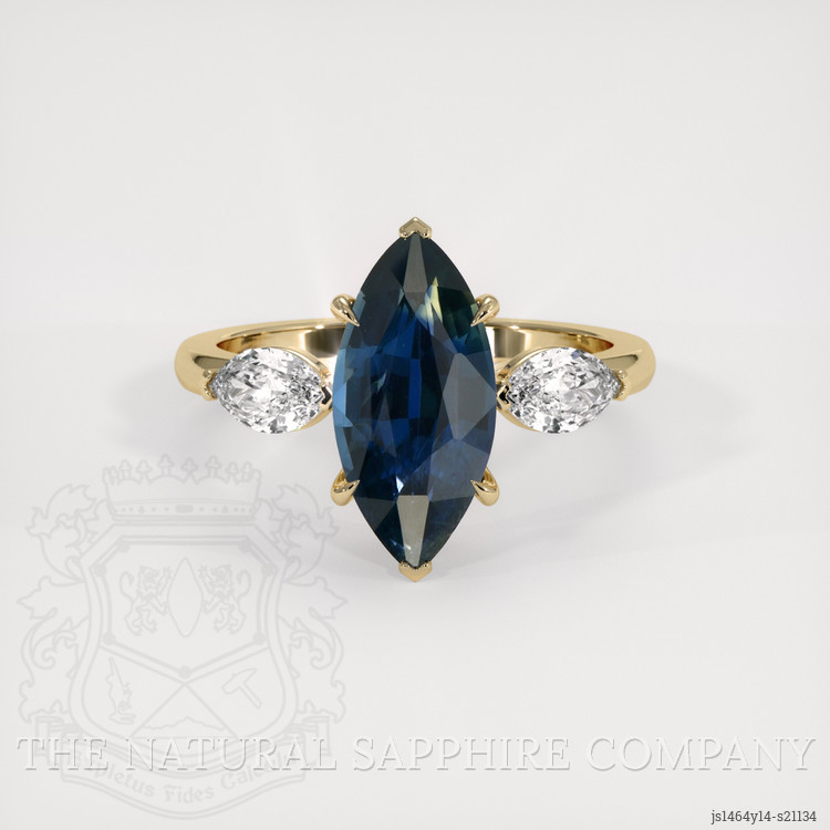 Complementing this captivating sapphire are white marquise-shaped lab-grown diamonds carefully selected for their quality and ethical origins. With a combined weight of approximately 0.66 carats, they accentuate the central stone, heightening the ring’s overall allure. These diamonds, with a clarity grade of VS1-VS2 and a color grade of E, ensure that you receive the same brilliance and sparkle as mined diamonds, yet with the assurance of sustainable sourcing. Set in lustrous 14K yellow gold, the band provides a classic and luxurious finish, further emphasizing the gemstone's standing.