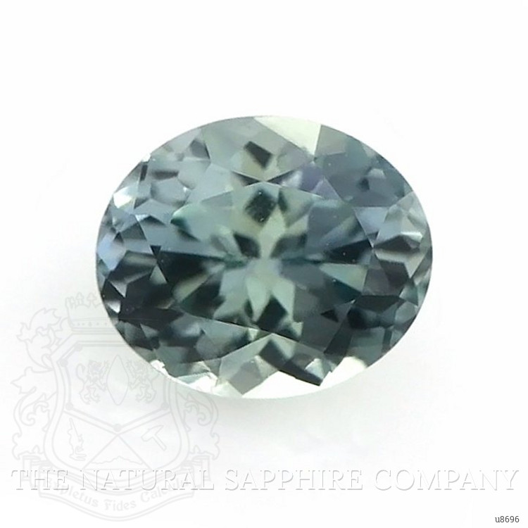 The ring features a beautiful, transparent 0.59 carat oval shape bluish green sapphire with the dimensions of 5.44 x 4.55 x 3.11 mm and a mixed brilliant cut. It has a clarity grade of very slightly included (evaluated at eye level), medium intense color saturation, and an excellent polish. The origin of this sapphire is Montana.
