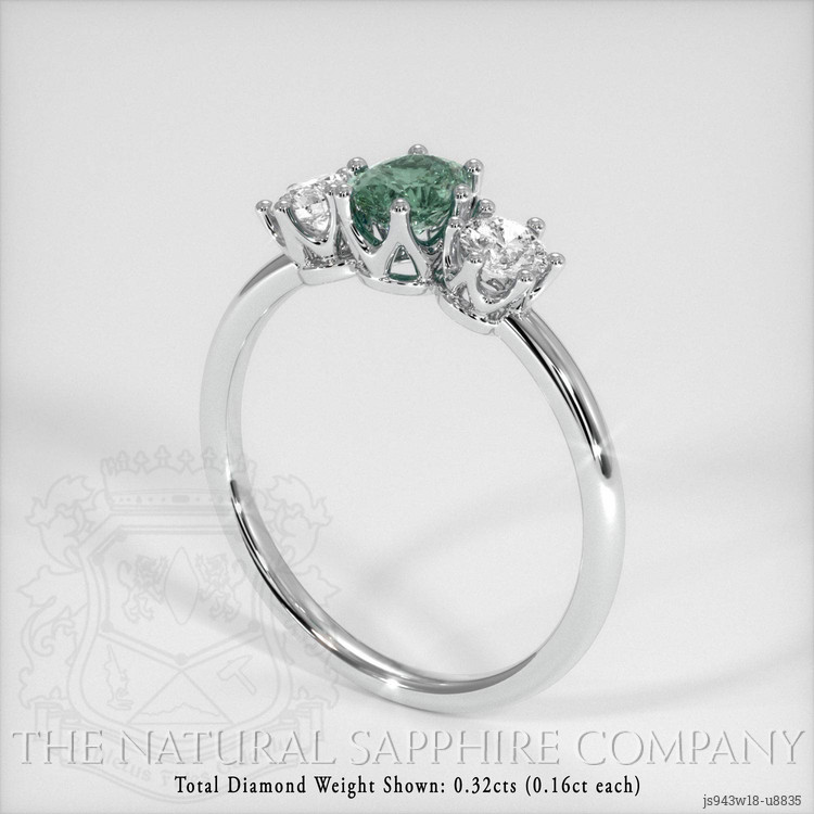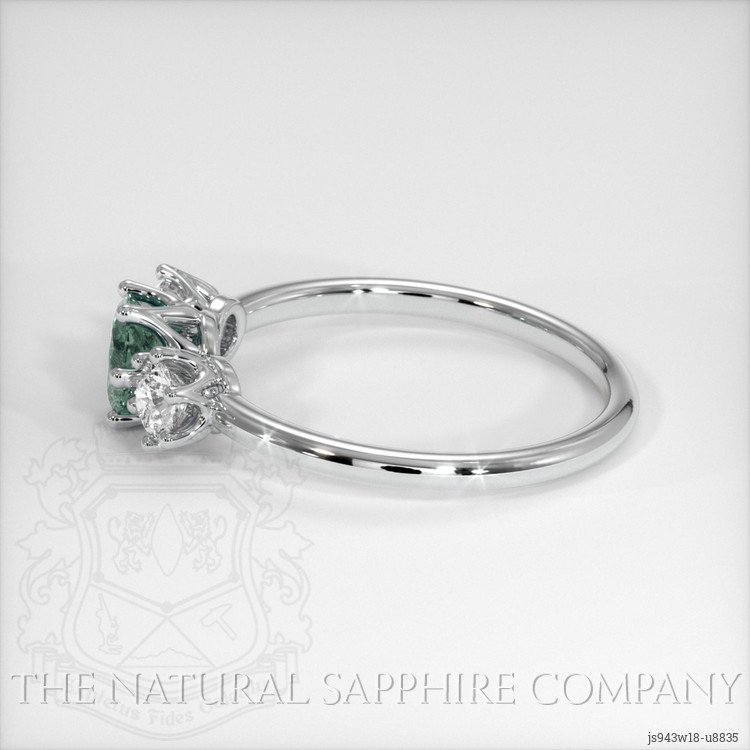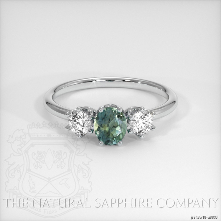 The ring features a beautiful, transparent 0.70 carat oval shape bluish green sapphire with the dimensions of 5.77 x 4.93 x 3.29 mm and a mixed brilliant cut. It has a clarity grade of very slightly included (evaluated at eye level), medium intense color saturation, and an excellent polish. The origin of this sapphire is Montana.