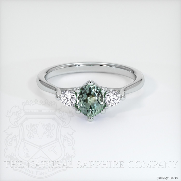 The ring features a beautiful, transparent 0.75 carat oval shape bluish green sapphire with the dimensions of 6.04 x 5.18 x 3.10 mm and a mixed brilliant cut. It has a clarity grade of very slightly included (evaluated at eye level), medium intense color saturation, and an excellent polish. The origin of this sapphire is Montana.