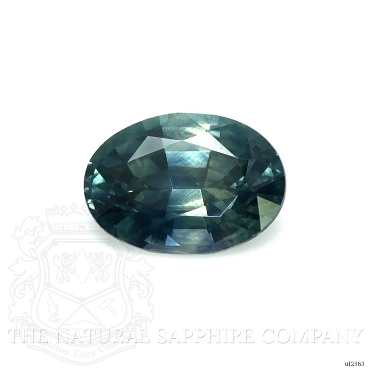The ring features a beautiful, transparent 0.77 carat oval shape bluish green sapphire with the dimensions of 6.60 x 4.68 x 3.22 mm and a mixed brilliant cut. It has a clarity grade of very slightly included (evaluated at eye level), intense color saturation, and an excellent polish. The origin of this sapphire is Montana.