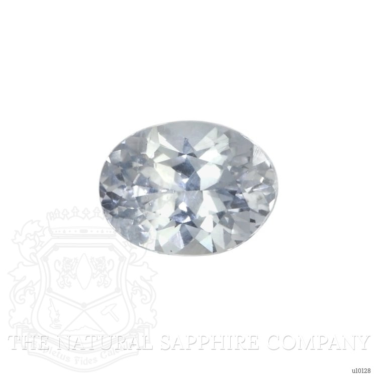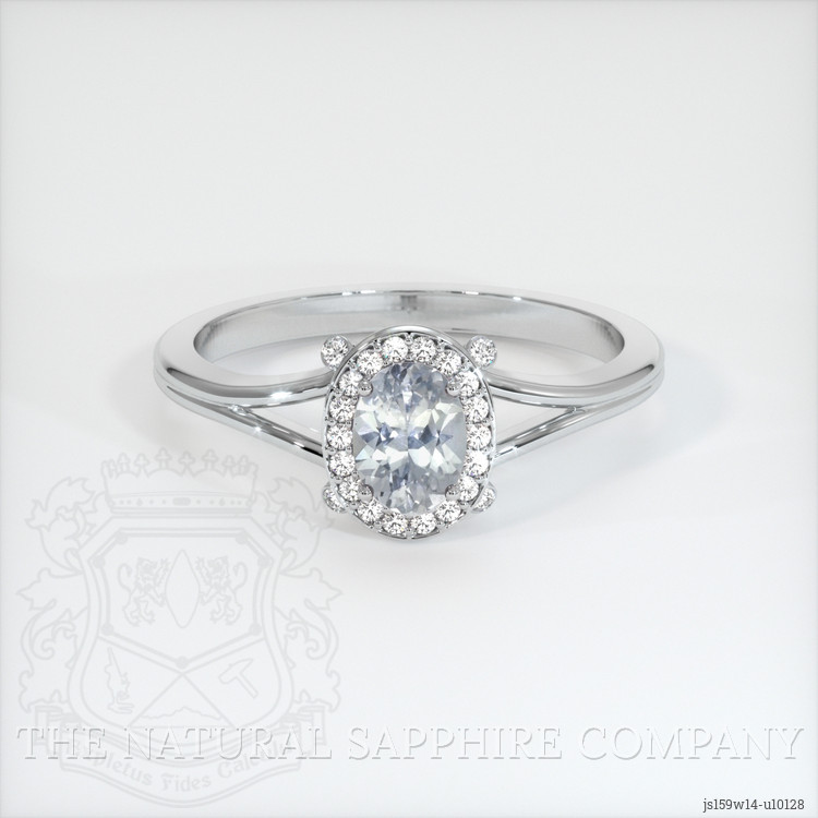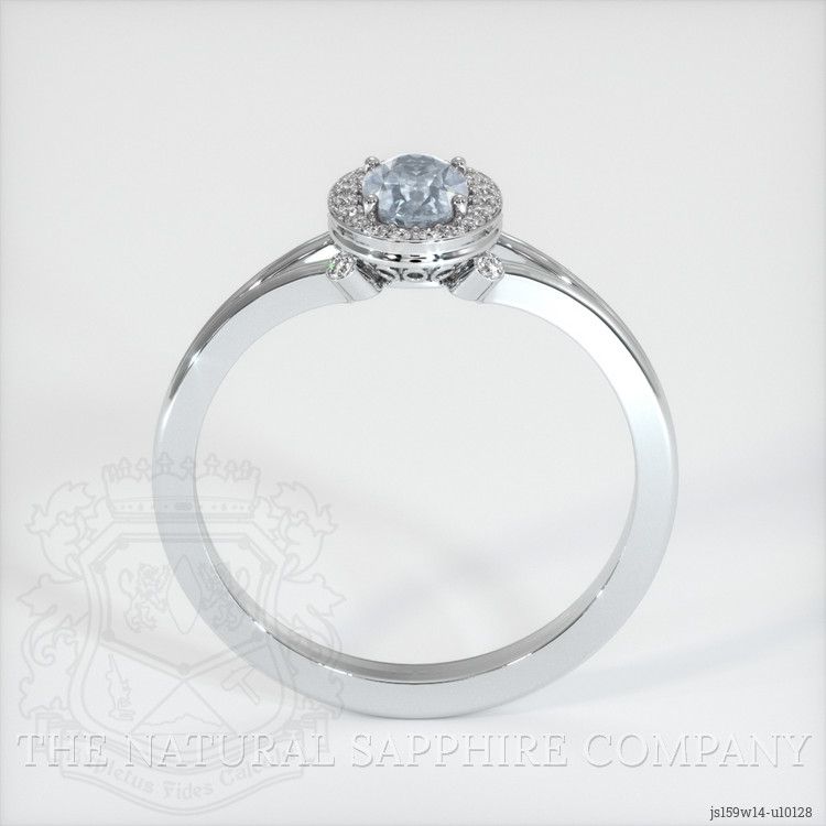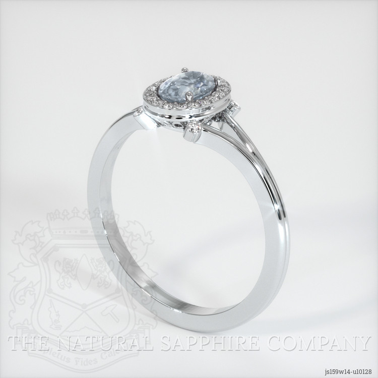 The ring features a beautiful, transparent 0.80 carat oval shape bluish green sapphire with the dimensions of 6.40 x 4.77 x 3.39 mm and a mixed brilliant cut. It has a clarity grade of very slightly included (evaluated at eye level), very light color saturation, and an excellent polish. The origin of this sapphire is Montana.