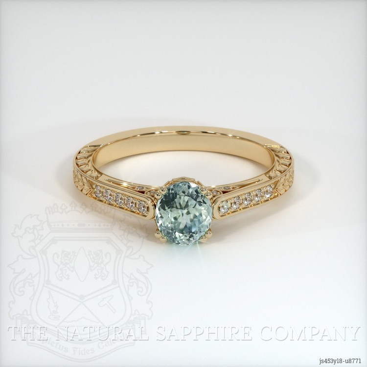 The ring features a beautiful, transparent 0.84 carat oval shape bluish green sapphire with the dimensions of 5.63 x 4.97 x 3.76 mm and a mixed brilliant cut. It has a clarity grade of very slightly included (evaluated at eye level), medium intense color saturation, and an excellent polish. The origin of this sapphire is Montana.