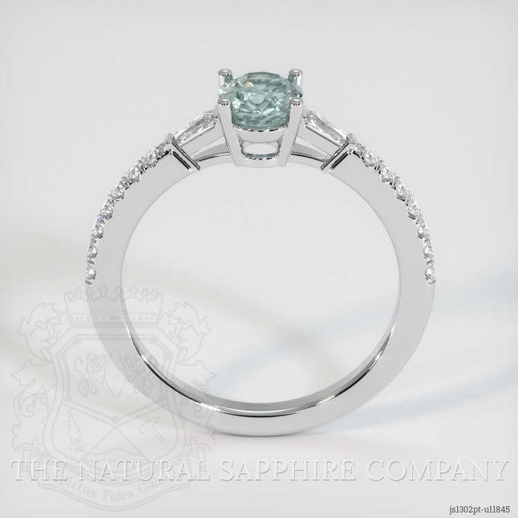 The ring features a beautiful, transparent 1.02 carat oval shape bluish green sapphire with the dimensions of 6.55 x 5.61 x 3.60 mm and a mixed brilliant cut. It has a clarity grade of eye clean (evaluated at eye level), medium color saturation, and an excellent polish. The origin of this sapphire is Montana.