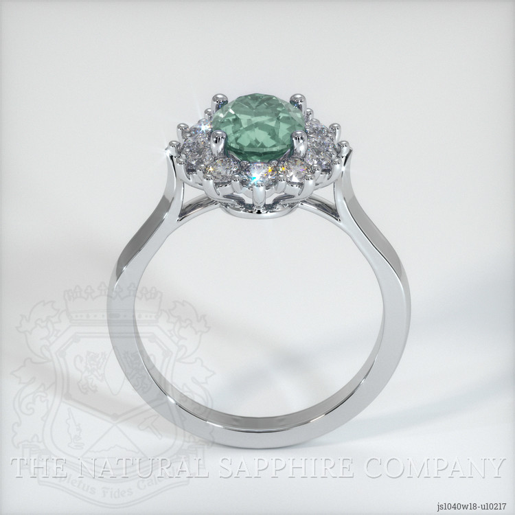 The ring features a beautiful, transparent 1.38 carat oval shape bluish green sapphire with the dimensions of 7.63 x 5.57 x 4.05 mm and a mixed brilliant cut. It has a clarity grade of very slightly included (evaluated at eye level), medium intense color saturation, and an excellent polish. The origin of this sapphire is Montana.
