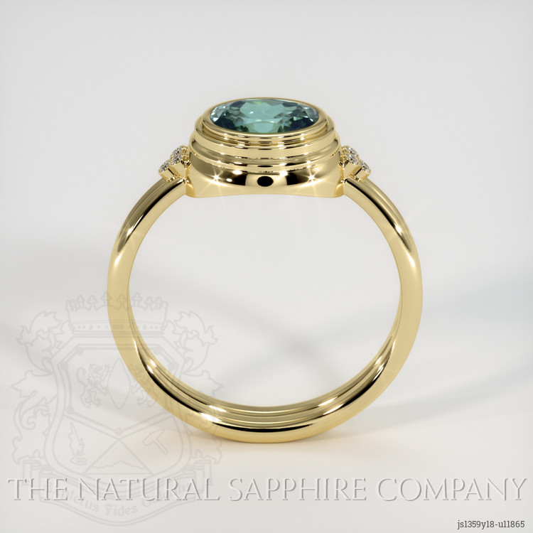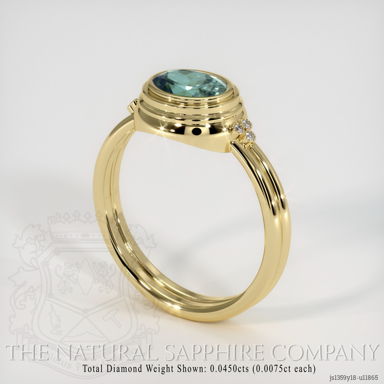 The ring features a beautiful, transparent 1.48 carat oval shape bluish green sapphire with the dimensions of 7.60 x 6.17 x 4.10 mm and a mixed brilliant cut. It has a clarity grade of very slightly included (evaluated at eye level), medium intense color saturation, and an excellent polish. The origin of this sapphire is Montana.