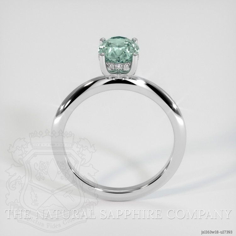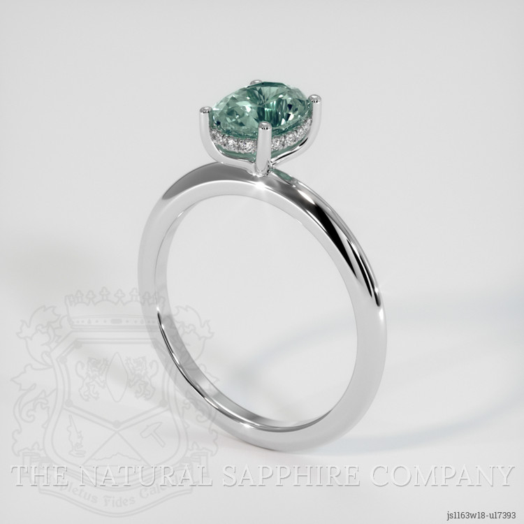 The ring features a beautiful, transparent 1.58 carat oval shape bluish green sapphire with the dimensions of 7.57 x 6.20 x 4.36 mm and a mixed brilliant cut. It has a clarity grade of very slightly included (evaluated at eye level), medium color saturation, and an excellent polish. The origin of this sapphire is Montana.