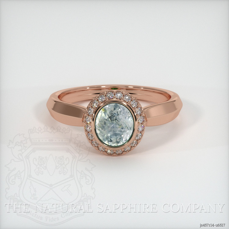 The ring features a beautiful, transparent 1.66 carat oval shape bluish green sapphire with the dimensions of 7.07 x 6.25 x 4.74 mm and a mixed brilliant cut. It has a clarity grade of slightly included (evaluated at eye level), medium light color saturation, and an excellent polish. The origin of this sapphire is Montana.
