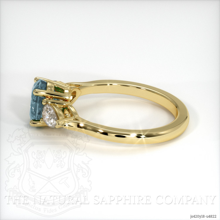 The ring features a beautiful, transparent 1.79 carat oval shape bluish green sapphire with the dimensions of 7.47 x 5.83 x 4.65 mm and a mixed brilliant cut. It has a clarity grade of very slightly included (evaluated at eye level), medium intense color saturation, and an excellent polish. The origin of this sapphire is Montana.