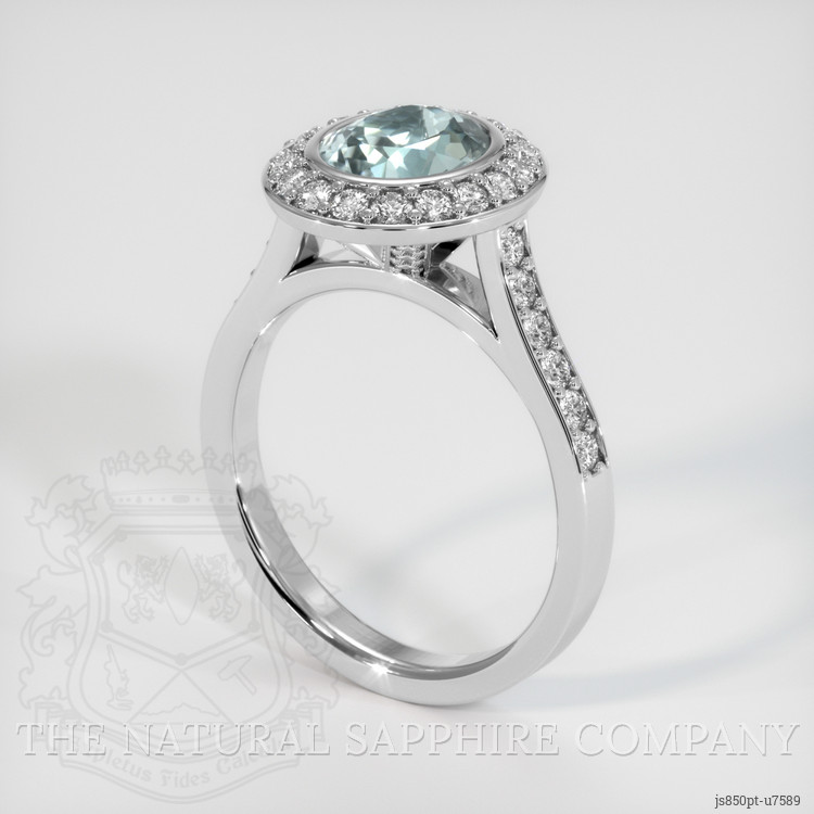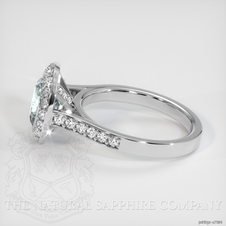 The ring features a beautiful, transparent 1.79 carat oval shape bluish green sapphire with the dimensions of 7.63 x 6.61 x 4.38 mm and a mixed brilliant cut. It has a clarity grade of very slightly included (evaluated at eye level), medium light color saturation, and an excellent polish. The origin of this sapphire is Montana.