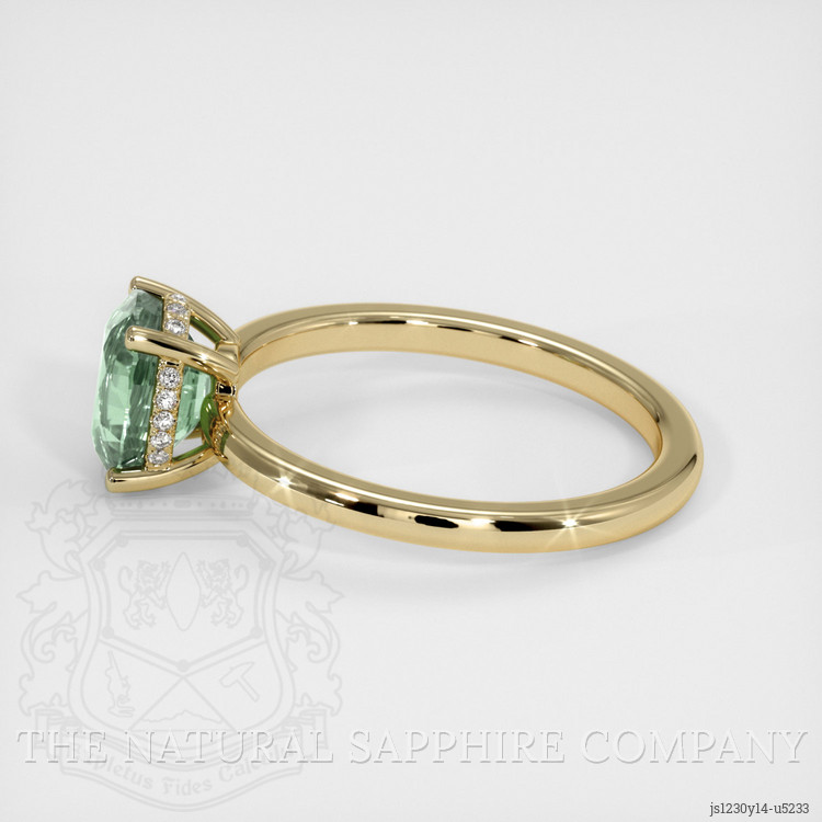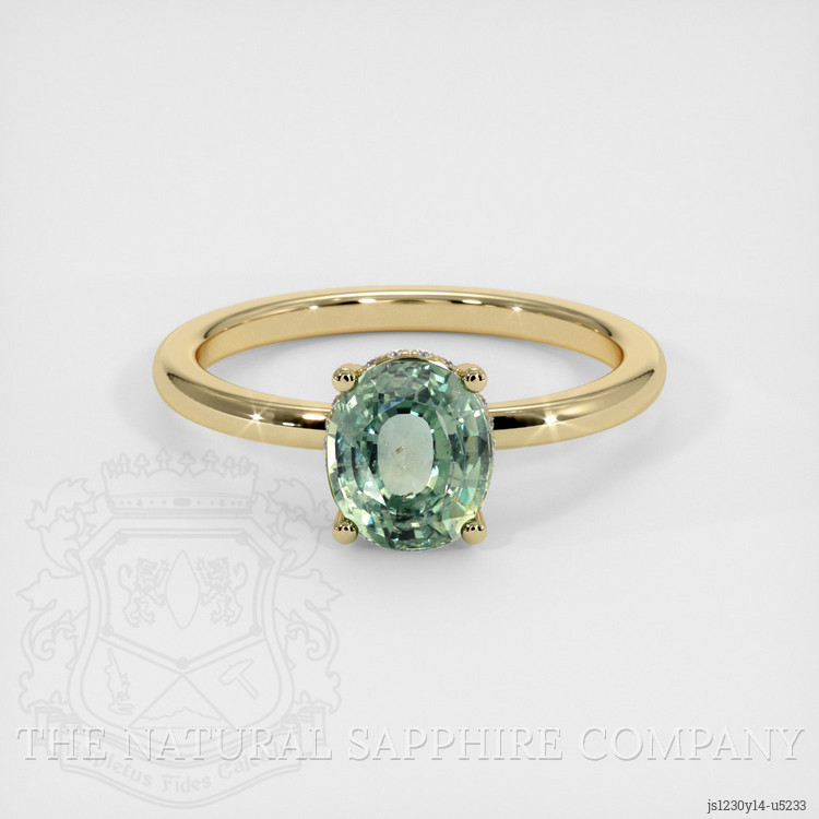 The ring features a beautiful, transparent 1.82 carat oval shape bluish green sapphire with the dimensions of 7.36 x 6.35 x 4.35 mm and a mixed brilliant cut. It has a clarity grade of very slightly included (evaluated at eye level), medium intense color saturation, and an excellent polish. The origin of this sapphire is Montana.