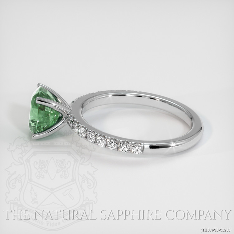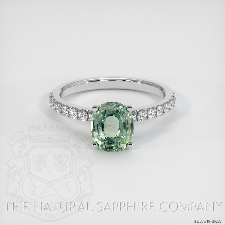 The ring features a beautiful, transparent 1.82 carat oval shape bluish green sapphire with the dimensions of 7.36 x 6.35 x 4.35 mm and a mixed brilliant cut. It has a clarity grade of very slightly included (evaluated at eye level), medium intense color saturation, and an excellent polish. The origin of this sapphire is Montana.