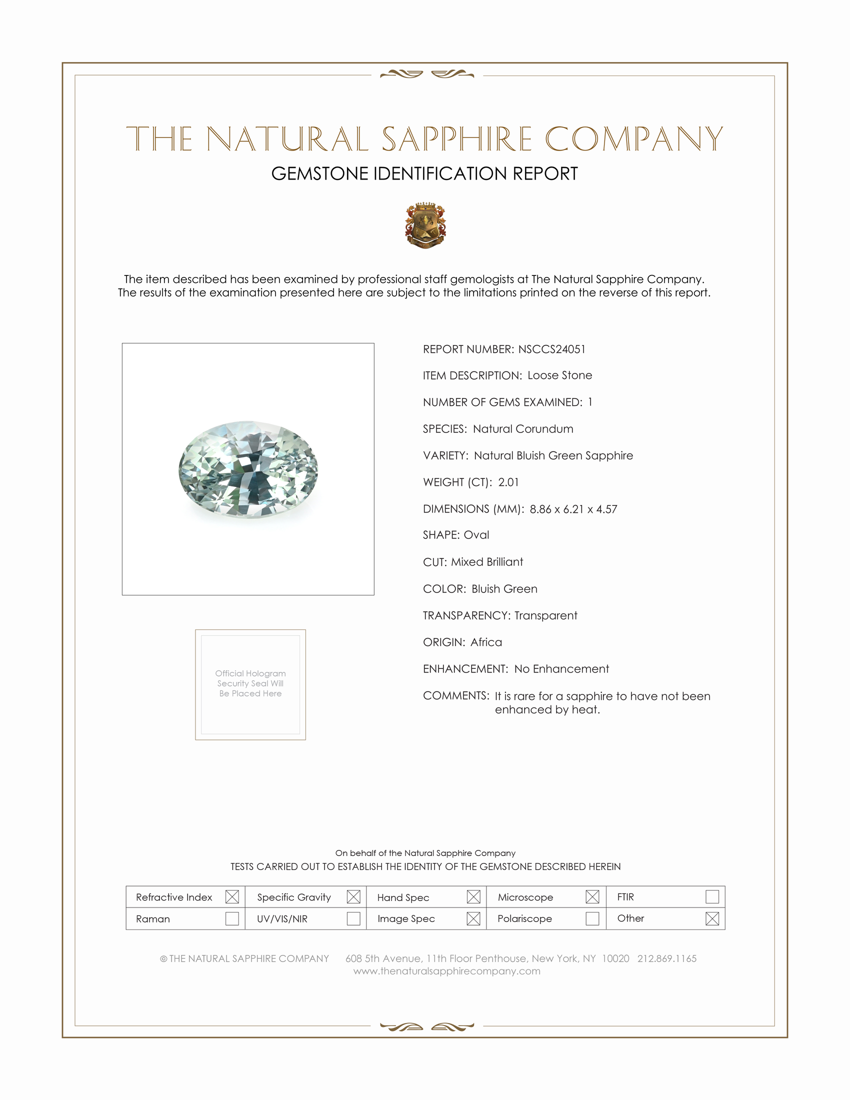 Discover the epitome of sophistication and craftsmanship with this exquisite ring from The Natural Sapphire Company. The centerpiece is a stunning 2.01 carat sapphire, cut into a classic oval shape that measures 8.86 x 6.21 x 4.57 mm. The mixed brilliant cut of the sapphire effortlessly captures and reflects light, maximizing the gem's natural allure. This particular sapphire boasts a transparent bluish-green hue, a testament to its African origins and rarity. Rated as eye clean, the sapphire reveals no inclusions at eye level, allowing its very light color saturation to evoke the serene depths of a tranquil sea. Polished to perfection, this gemstone rivals the quality and precision often found in luxury brands known for their meticulous attention to detail.