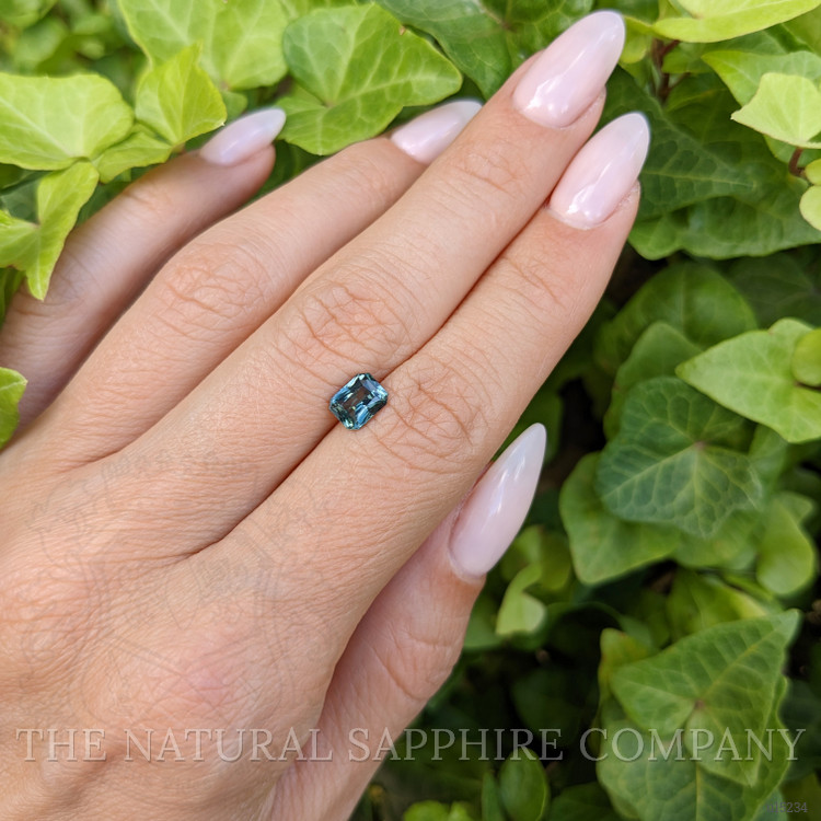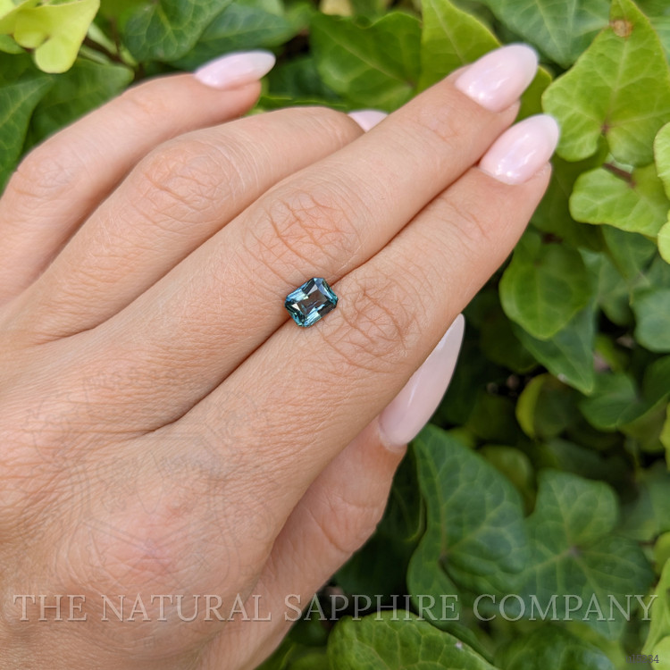 The ring features a beautiful, transparent 1.14 carat radiant shape bluish green sapphire with the dimensions of 6.31 x 4.93 x 3.52 mm and a radiant cut. It has a clarity grade of very slightly included (evaluated at eye level), medium intense color saturation, and an excellent polish. The origin of this sapphire is Tanzania.