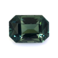 The ring features a beautiful, transparent 1.39 carat radiant shape bluish green sapphire with the dimensions of 7.23 x 5.02 x 3.99 mm and a mixed brilliant cut. It has a clarity grade of eye clean (evaluated at eye level), vivid color saturation, and an excellent polish. The origin of this sapphire is Tanzania.