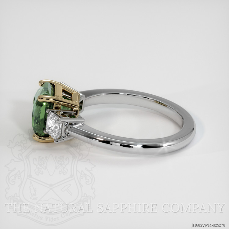 Flanking the center sapphire are two white asscher octagon shaped natural diamonds weighing approximately 0.46 carats, with clarity grades of Very Slightly Included in the VS1 to VS2 range, and a color grade of E. These diamonds are chosen for their crisp geometric facets, which echo the radiant center while reflecting light in balanced, vintage inspired planes. Set partly in glowing 14K yellow gold that forms a warm crown around the sapphire, and partly in refined 14K white gold for the band and diamond settings, the mixed metal composition recalls centuries of jewelry tradition where golds were combined to flatter both skin tones and stone color. The juxtaposition of warm yellow gold and cool white gold enhances the sapphire s bluish green tone, while the E color of the diamonds provides a near colorless contrast that reads as timeless and elegant. For an engagement ring, these elements together create a visual narrative of commitment that is both bold and quietly assured, a jewel designed to be treasured and handed down.