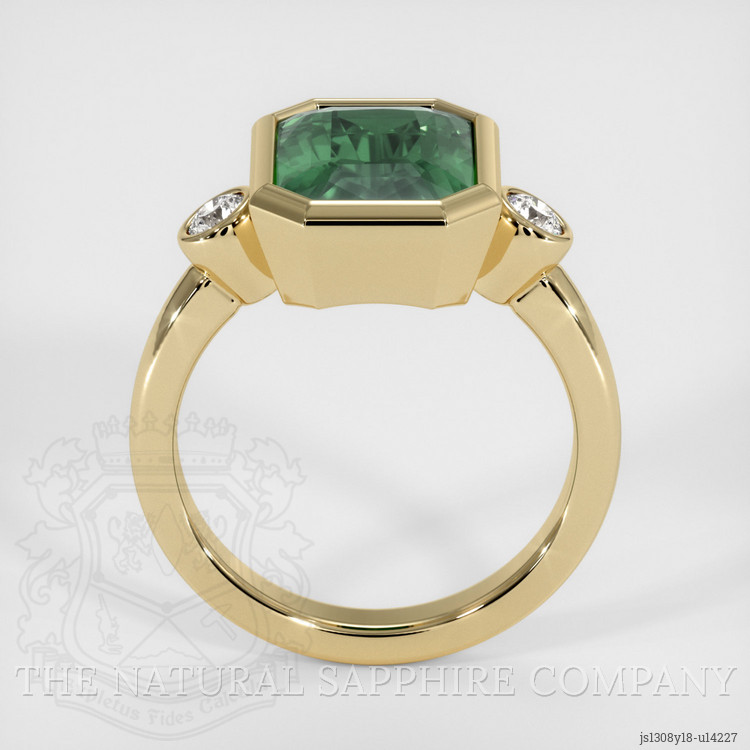 The ring features a beautiful, transparent 4.76 carat radiant shape bluish green sapphire with the dimensions of 10.75 x 8.26 x 5.24 mm and a radiant cut. It has a clarity grade of very slightly included (evaluated at eye level), intense color saturation, and an excellent polish. The origin of this sapphire is Ceylon (Sri Lanka).