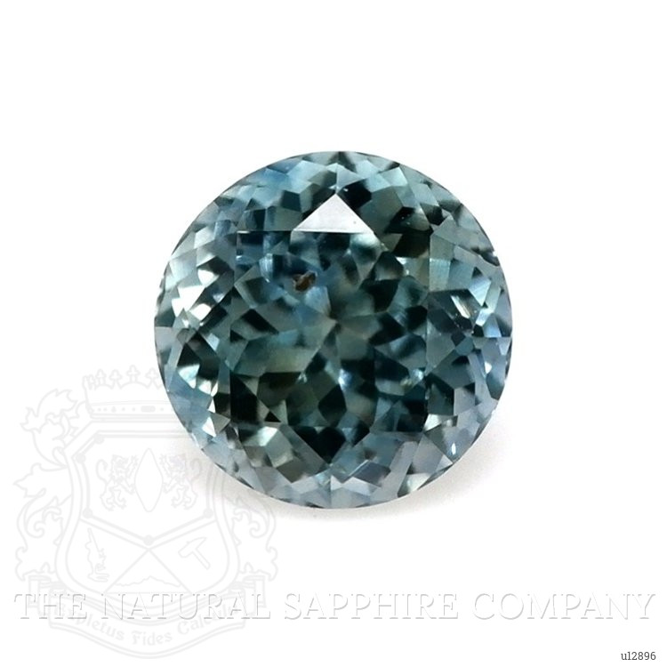 The ring features a beautiful, transparent 0.57 carat round shape bluish green sapphire with the dimensions of 4.66 x 4.64 x 3.44 mm and a mixed brilliant cut. It has a clarity grade of very slightly included (evaluated at eye level), medium intense color saturation, and an excellent polish. The origin of this sapphire is Montana.