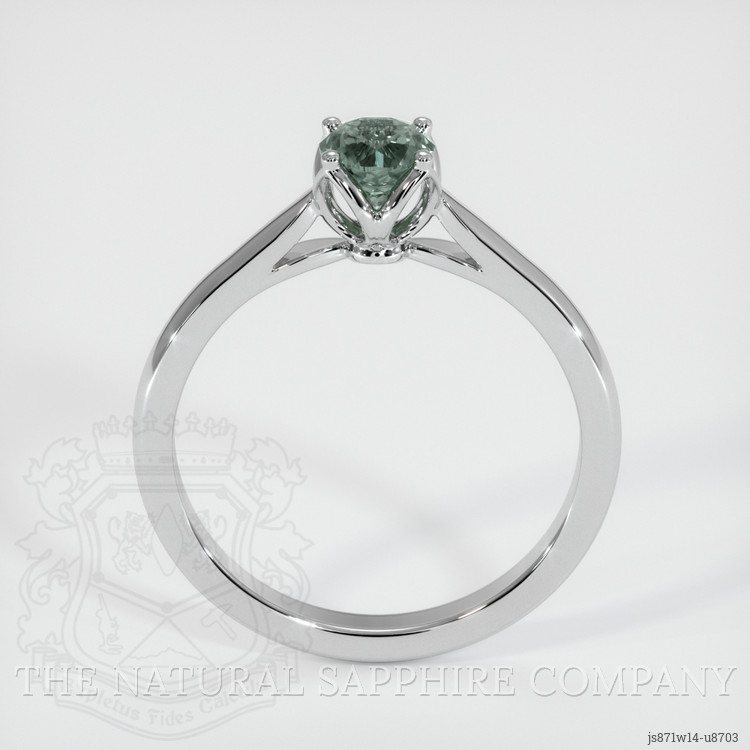The ring features a beautiful, transparent 0.61 carat round shape bluish green sapphire with the dimensions of 4.65 x 4.60 x 3.57 mm and a modified brilliant cut. It has a clarity grade of very slightly included (evaluated at eye level), medium color saturation, and an excellent polish. The origin of this sapphire is Montana.